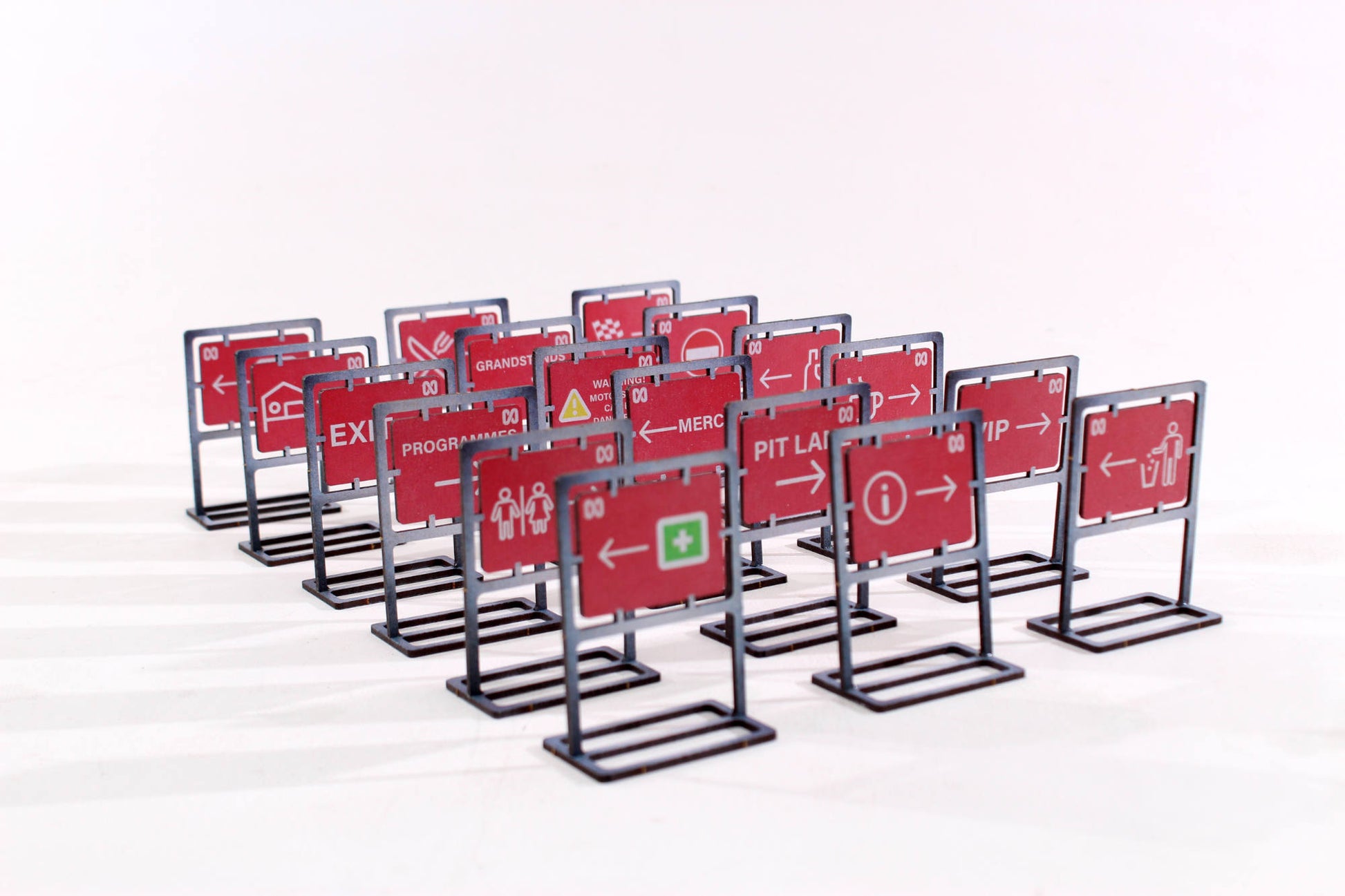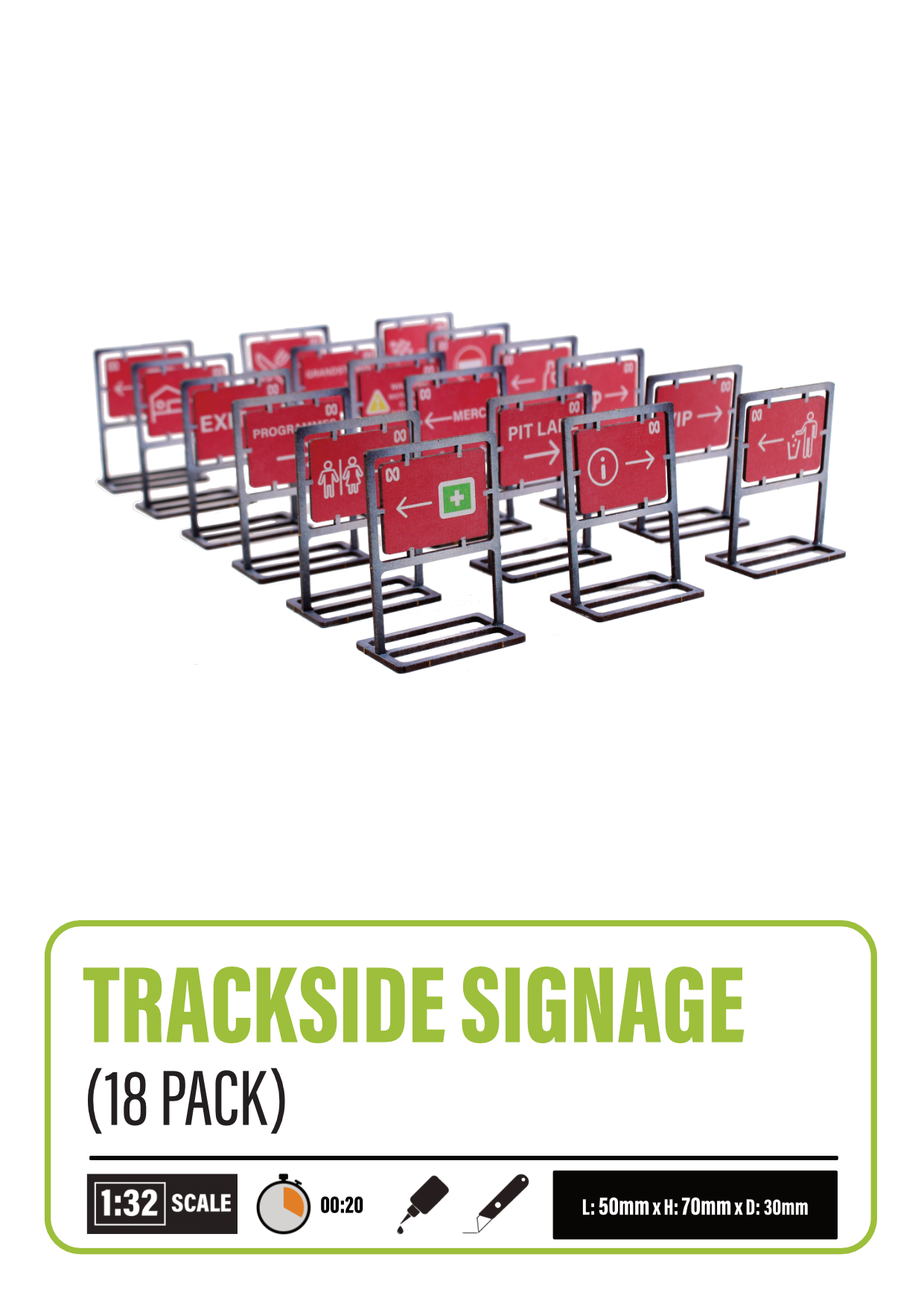 Use these trackside signs to find your way around your Scalextric slot car circuit! Each pack contains parts to make up 18 different signs to decorate your track.